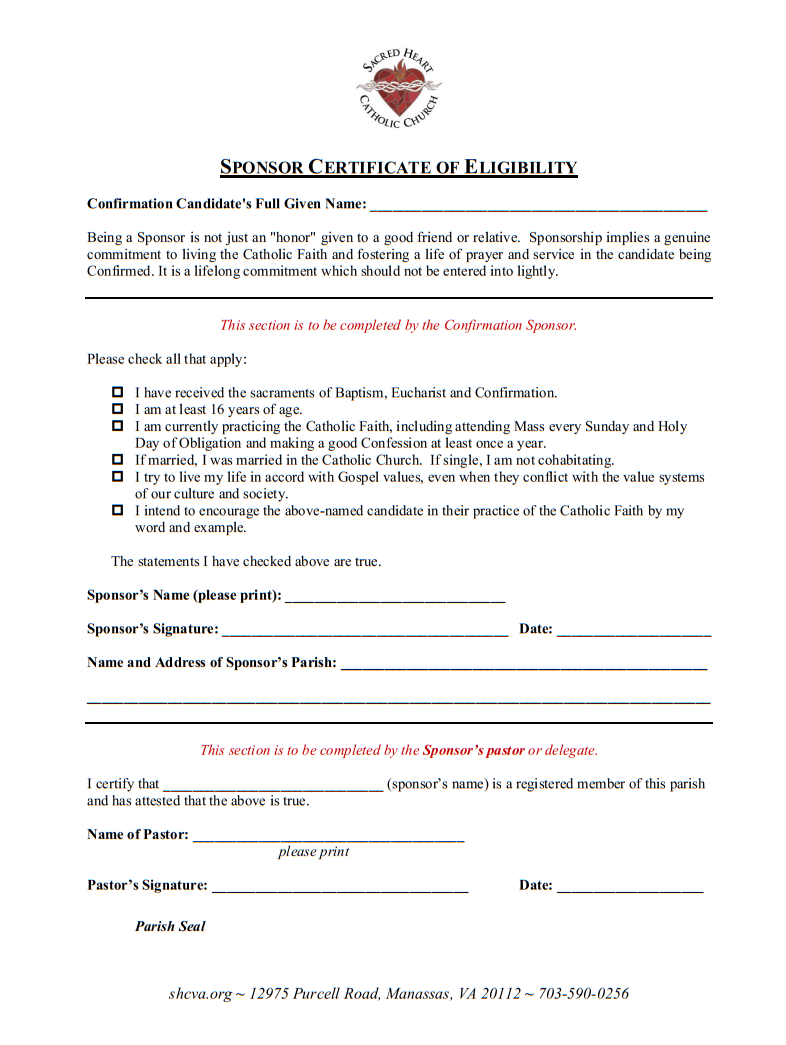 Students customarily receive the sacrament of confirmation during their eighth grade year in the Diocese of Arlington, upon the completion of a special two-year program of formation. Confirmation of students in our parish is normally celebrated in the spring at Sacred Heart Church by the Bishop of Arlington, or by another bishop designated by the diocese.