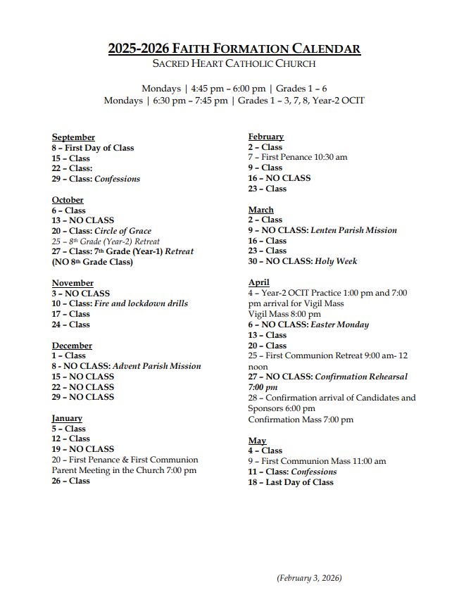 Sacred Heart offers faith formation classes for students in grades 1-8 who attend public or other non-Catholic schools which include the preparation necessary to receive the sacraments of First Penance, First Holy Communion and Confirmation.