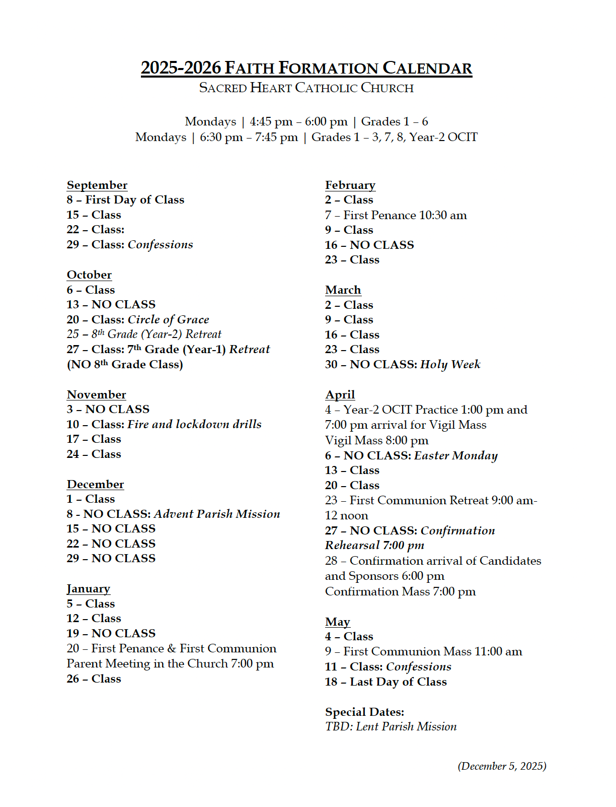 Important Dates for Confirmation 2026